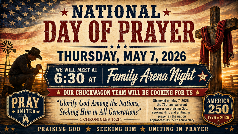 Join us on Thursday May 7, 2026 6:30pm at the CRCC Arena, we will be observing the National Day of Prayer We will be having a short devotion and and message brought to us by Bro. John Spurgeon Our CRCC Chuckwagon Team will be preparing the supper meal